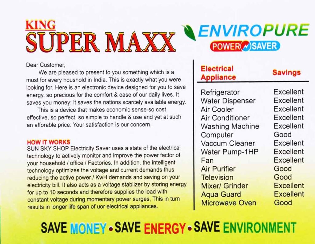 - നിങ്ങളുടെ വൈദ്യുതി ബില്ലുകളിൽ വലിയ തുക ലാഭിക്കാൻ സഹായിക്കുന്നതിന് ശ്രദ്ധേയമായി പ്രവർത്തിക്കുന്ന ഒരു ജർമ്മൻ സാങ്കേതിക കണ്ടുപിടുത്തമാണ് ഇലക്ട്രിസിറ്റി പവർ സേവർ.